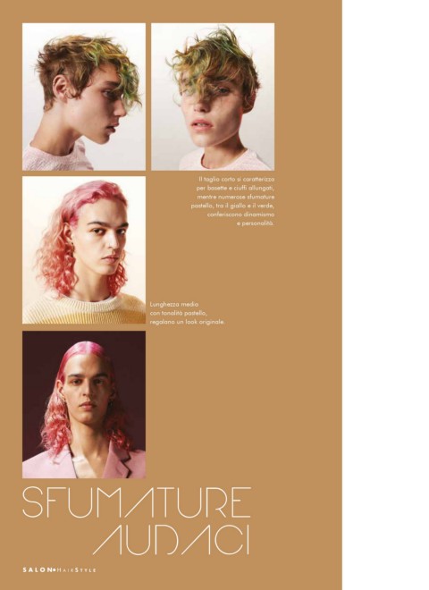 Il taglio corto si caratterizza per basette e ciuffi allungati, mentre numerose sfumature pastello, tra il giallo e il verde, conferiscono dinamismo e personalità. Lunghezza media con tonalità pastello, regalano un look originale. SFUMATURE AUDACI